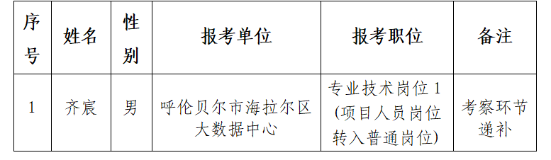 根據(jù)《2025年內(nèi)蒙古自治區(qū)事業(yè)單位公開招聘工作人員公告》規(guī)定,通過網(wǎng)上報(bào)名、資格初審、筆試、資格復(fù)審、面試、體檢和考察等環(huán)節(jié),現(xiàn)對報(bào)考海拉爾區(qū)綜合類崗位(第五批)1名擬聘用人員進(jìn)行公示。