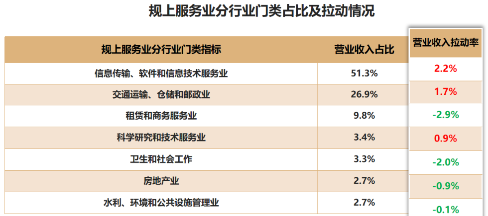 1-2月份,規(guī)模以上服務(wù)業(yè)47家企業(yè),營業(yè)收入同比下降1.1%。7個(gè)行業(yè)門類中3個(gè)門類營業(yè)收入保持不同程度增長。