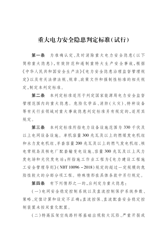 名稱: 重大電力安全隱患判定標準(試行) 文號: