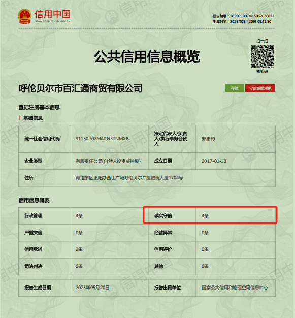 信用企業(yè)(呼倫貝爾市百匯通商貿(mào)有限公司)