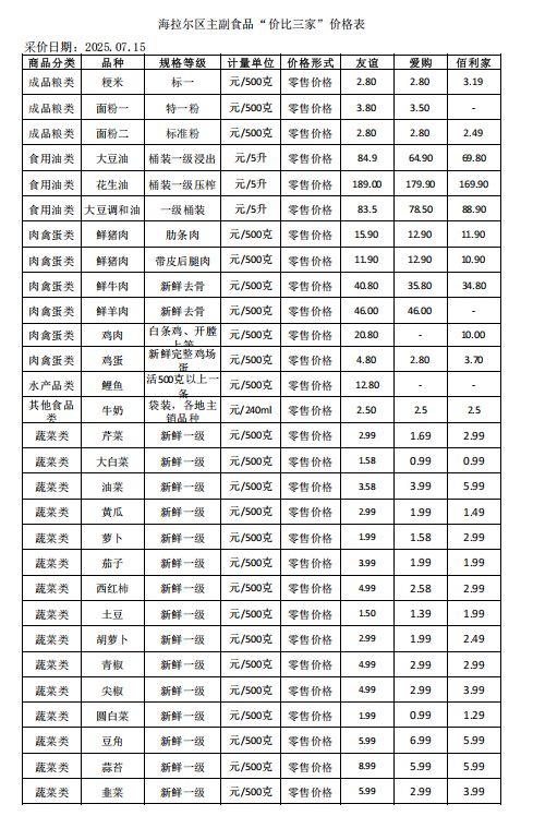 海拉爾區(qū)主副食品“價(jià)比三家”價(jià)格表