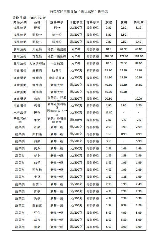 海拉爾區(qū)主副食品“價比三家”價格表