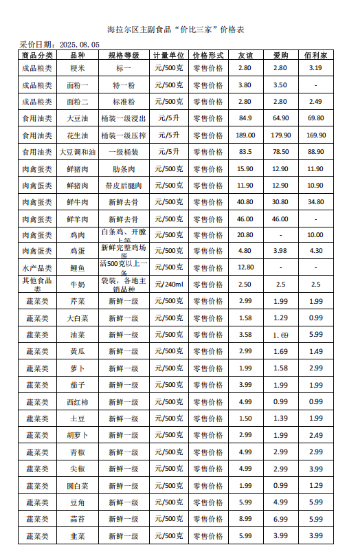海拉爾區(qū)主副食品“價(jià)比三家”價(jià)格表