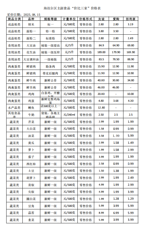 名稱: 海拉爾區(qū)主副食品“價比三家”價格表 文號: