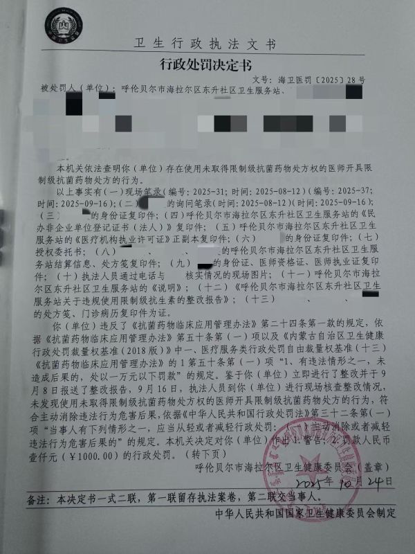 | 名稱: | 呼倫貝爾市海拉爾區(qū)東升社區(qū)衛(wèi)生服務(wù)站使用未取得限制級(jí)抗菌藥物處方權(quán)的醫(yī)師開(kāi)具限制級(jí)抗菌藥物處方案 | 文號(hào): | 海衛(wèi)醫(yī)罰〔2025〕28號(hào) |
