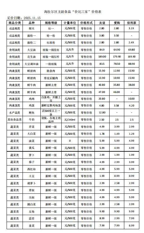 名稱: 海拉爾區(qū)主副食品“價比三家”價格表 文號: