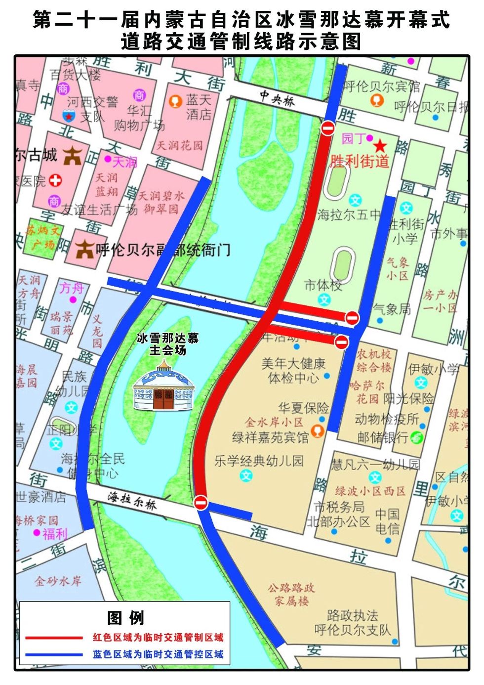 第二十一屆內(nèi)蒙古自治區(qū)冰雪那達(dá)慕開(kāi)幕式彩排分別于2025年12月19日和20日進(jìn)行。為確保彩排期間道路交通安全、暢通、有序,根據(jù)《中華人民共和國(guó)道路交通安全法》的有關(guān)規(guī)定,呼倫貝爾市公安局交通管理支隊(duì)中心城區(qū)大隊(duì)將對(duì)部分道路采取臨時(shí)交通限制措施?,F(xiàn)將有關(guān)事項(xiàng)通告如下: