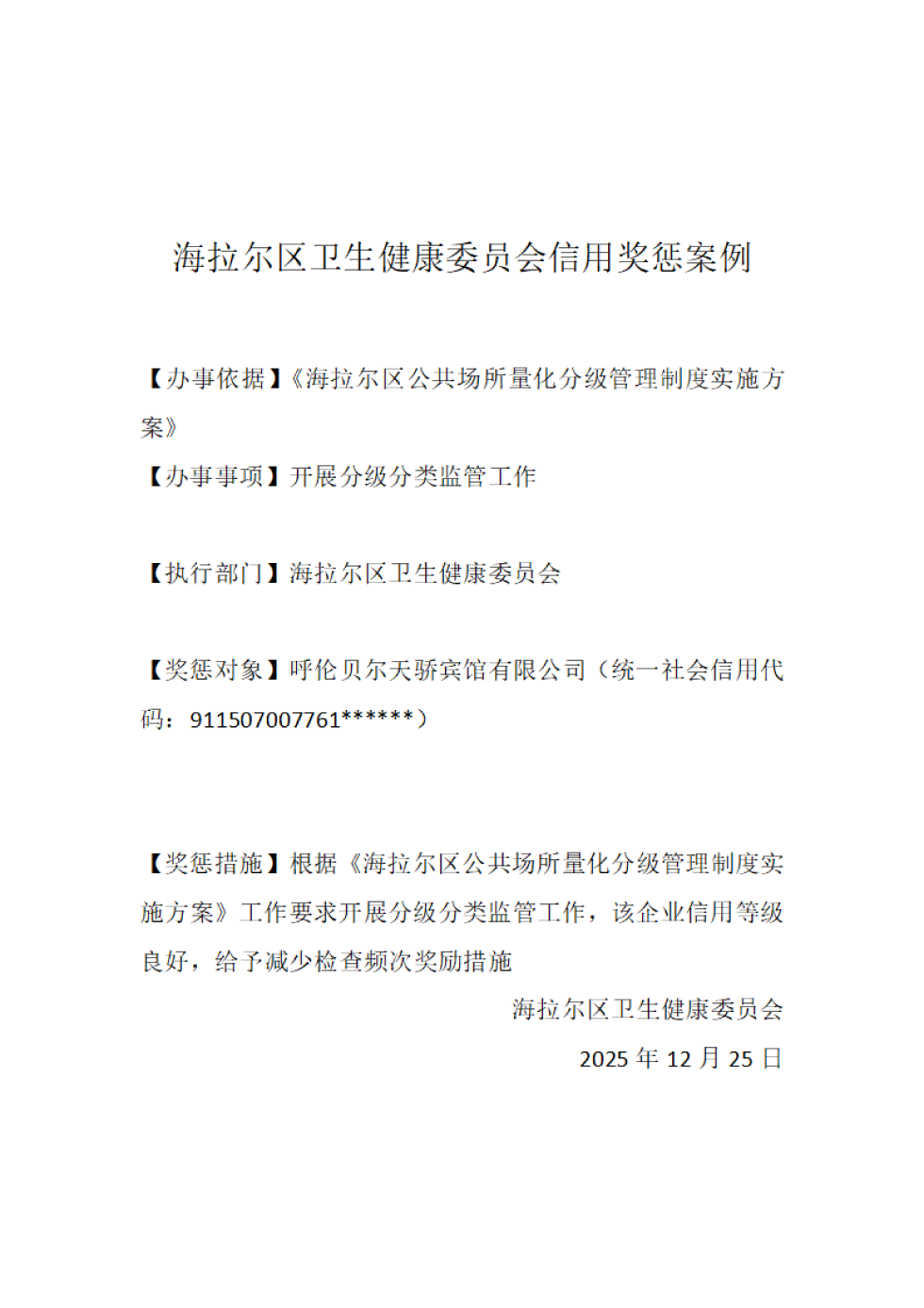 名稱: 2025年12月海拉爾區(qū)衛(wèi)生健康委員會(huì)信用獎(jiǎng)懲案例 文號(hào):