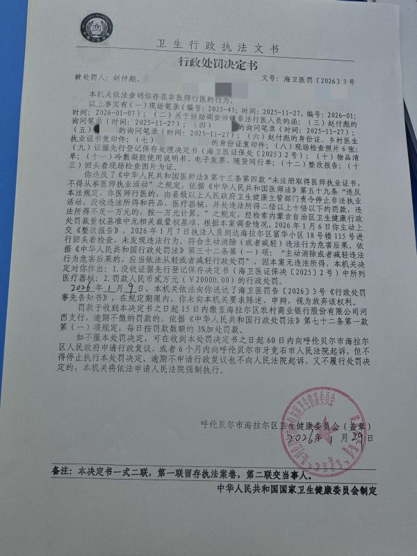 名稱: 趙付彪非醫(yī)師行醫(yī)案 文號: 海衛(wèi)醫(yī)罰〔2026〕3號