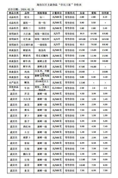 海拉爾區(qū)主副食品“價(jià)比三家”價(jià)格表