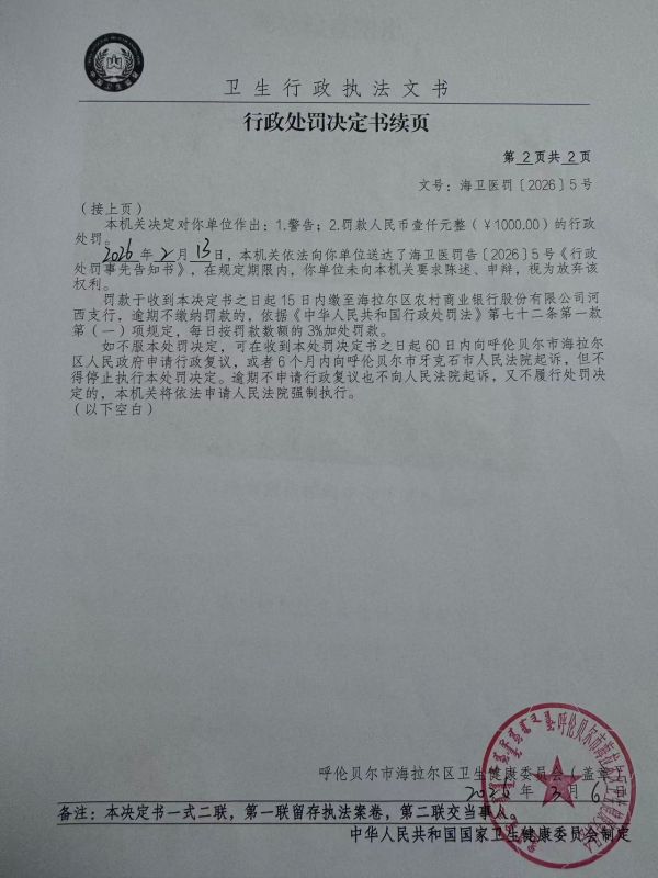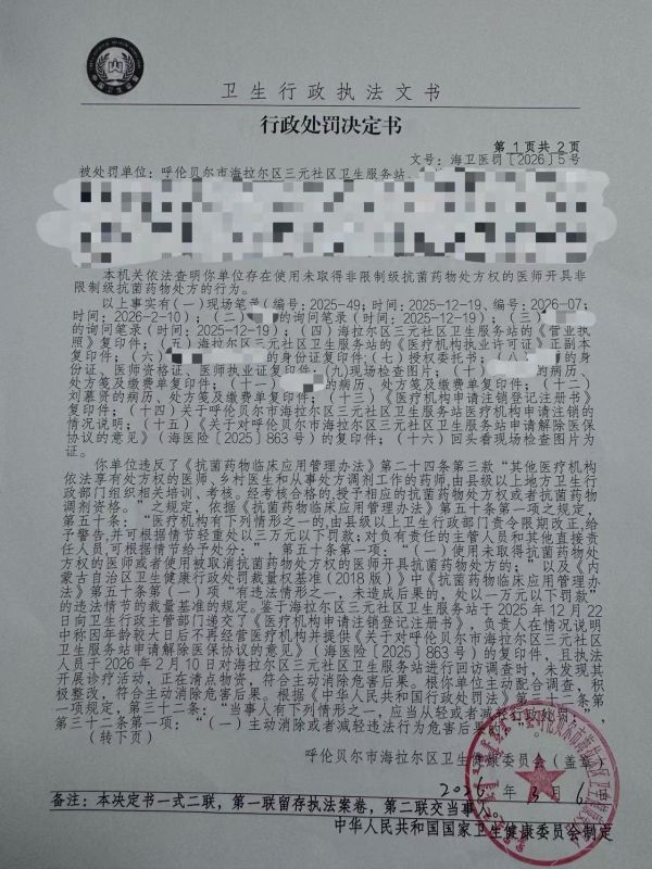 | 名稱: | 呼倫貝爾市海拉爾區(qū)三元社區(qū)衛(wèi)生服務(wù)站使用未取得非限制級(jí)抗菌藥物處方權(quán)的醫(yī)師開具非限制級(jí)抗菌藥物案 | 文號(hào): | 海衛(wèi)醫(yī)罰〔2026〕5號(hào) |