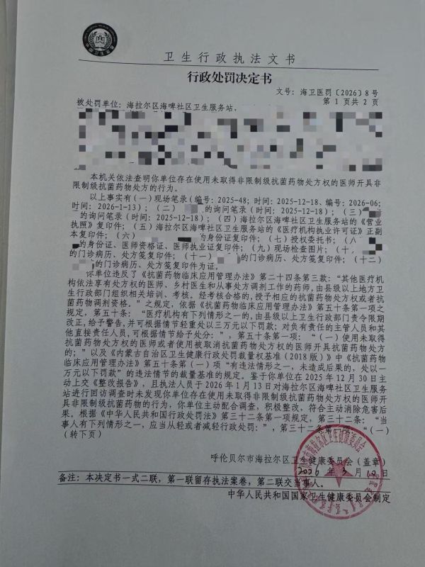 | 名稱: | 海拉爾區(qū)海啤社區(qū)衛(wèi)生社區(qū)服務(wù)站使用未取得非限制級(jí)抗菌藥物處方權(quán)的醫(yī)師開具非限制級(jí)抗菌藥物處方案。 | 文號(hào): | 無 |
