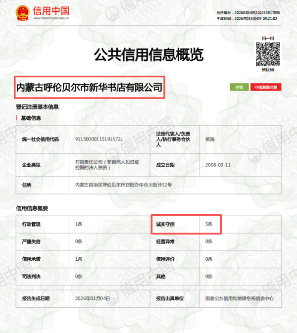 信用企業(yè)(內(nèi)蒙古呼倫貝爾市新華書(shū)店有限公司91150000115191572L)