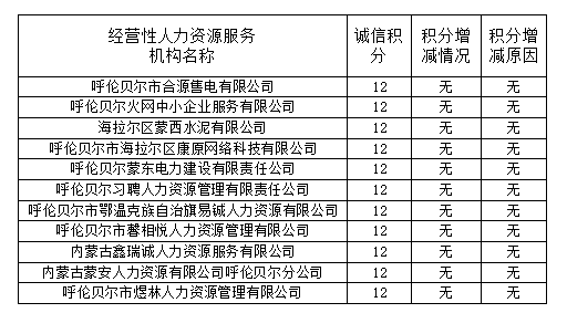 2026年第一季度海拉爾區(qū)經(jīng)營性人力資源服務(wù)機(jī)構(gòu)誠信積分情況公布