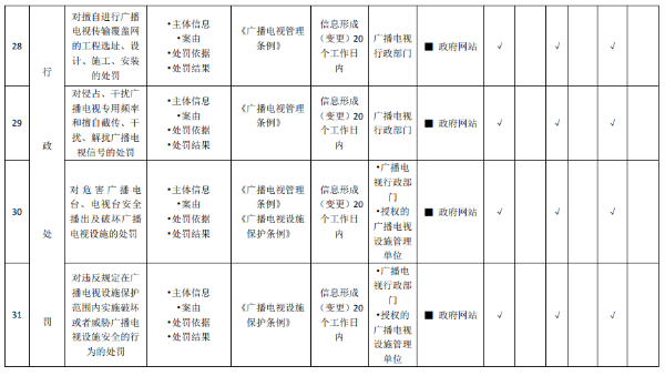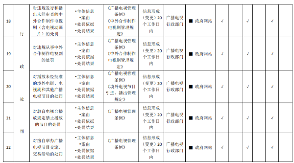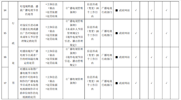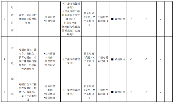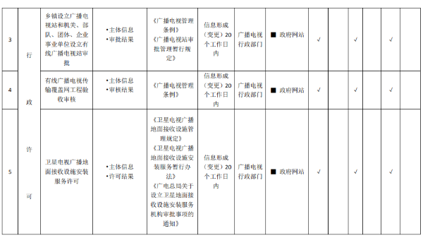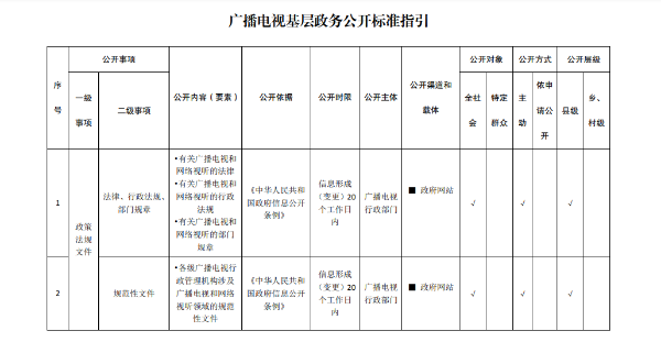 國(guó)家廣播電視總局辦公廳印發(fā)《廣播電視基層政務(wù)公開標(biāo)準(zhǔn)指引》按照《國(guó)務(wù)院辦公廳關(guān)于全面推進(jìn)基層政務(wù)公開標(biāo)準(zhǔn)化規(guī)范化工作的指導(dǎo)意見》和《國(guó)務(wù)院辦公廳關(guān)于印發(fā) 2021年政務(wù)公開工作要點(diǎn)的通知》相關(guān)要求,為推動(dòng)全國(guó)廣播電視和網(wǎng)絡(luò)視聽領(lǐng)域基層政務(wù)公開標(biāo)準(zhǔn)化規(guī)范化,提升基層政務(wù)公開和政務(wù)服務(wù)水平,特編制《廣播電視基層政務(wù)公開標(biāo)準(zhǔn)指引》(以下簡(jiǎn)稱《指引》)。